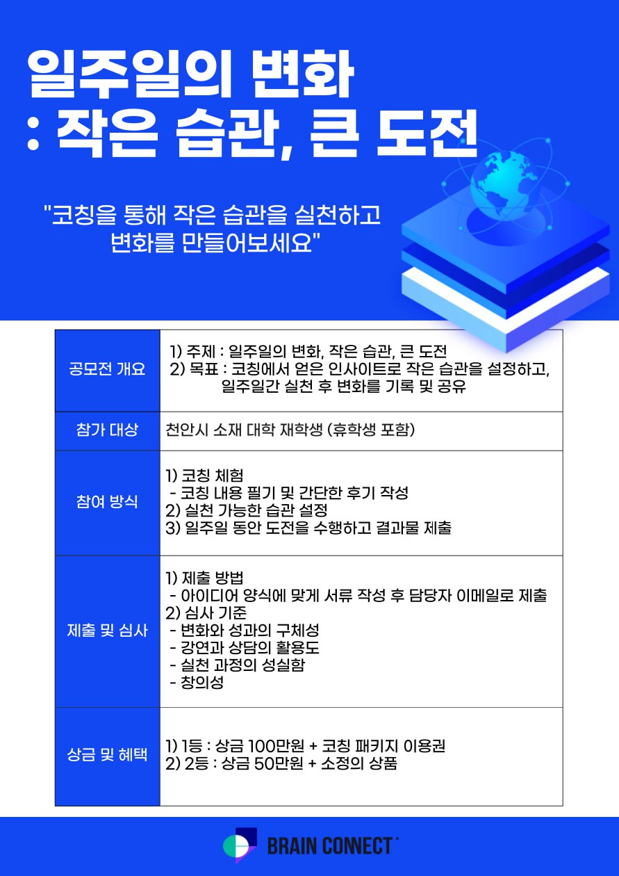 | 시상금 | - 1등 : 상금 100만원 + 코칭 패키지 이용권 - 2등 : 상금 50만원 + 소정의 상품 | |